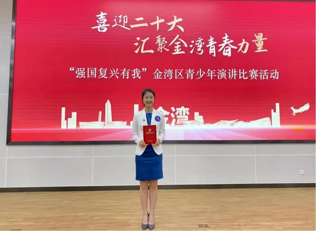在本月金湾区图书馆举办的喜迎二十大”之“强国复兴有我”金湾区青少年演讲比赛活动中,文化与旅游学院21级新闻班的曾宝仪获得大学组“一等奖”。