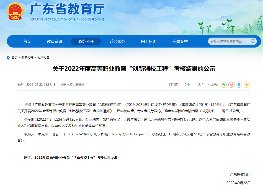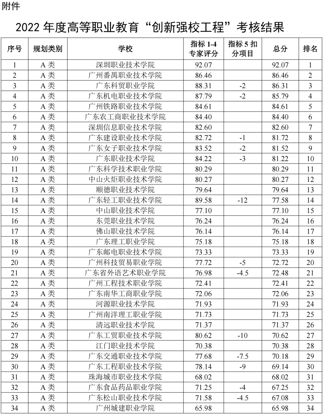 近日,省教育厅发出《关于2022年度高等职业教育“创新强校工程”考核结果的公示》,本次共有90所高校进入考核(名单附后),深职番职前2!