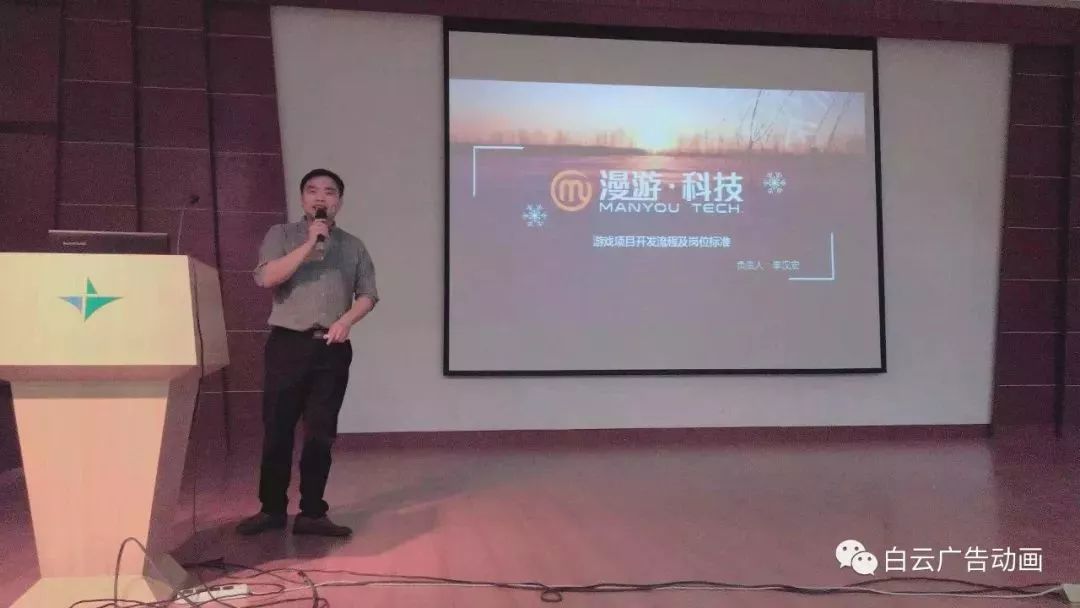 漫游科技项目研发经理李汉宏先生随即带来了专业CG技术分析。李经理首先讲解了游戏开发制作系统流程,随后阐述了当前市场行业所需人才类型,同时辅以漫游科技实际案例开展并讲解。李经理的讲解大至行业准则,小至岗位阐述,讲解通俗易懂,引人入胜,引来白云学子的阵阵掌声。