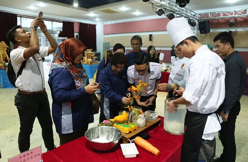 最后,随行的彭亨关丹工艺学院学生还与我院雕刻协会的学子们进行了一场气氛友好的果雕PK表演,双方学生都利用在学校所学的专业技能,向在场的老师和同学们展示出了各自的精湛技艺。