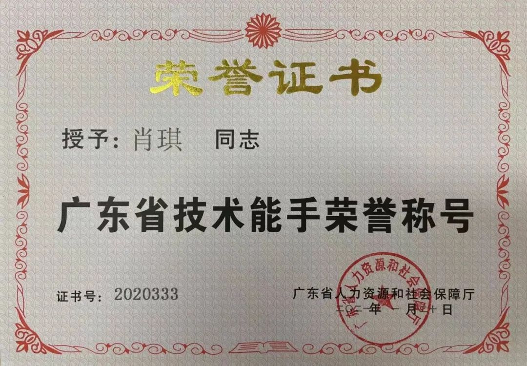 获得“广东省技术能手”称号