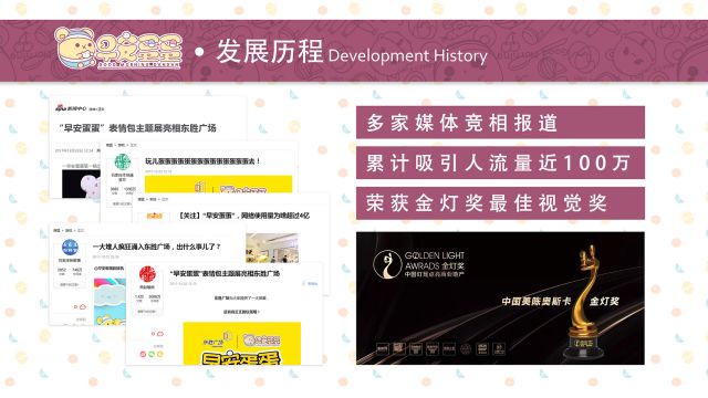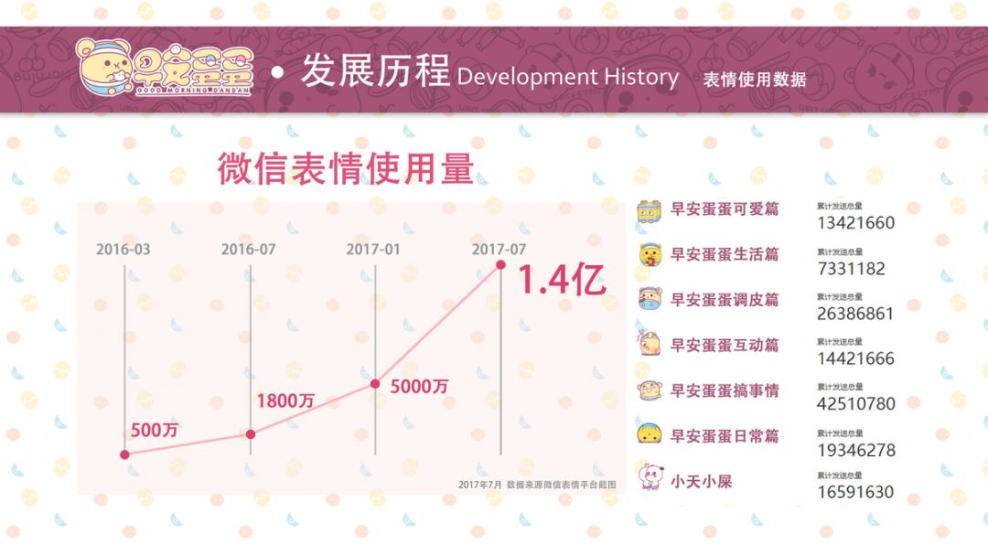 【早安蛋蛋】是由白云创业园梦工坊团队原创的动漫卡通形象,已经申请了美术专利权及商标,“早安蛋蛋”形象圆滑可爱、造型简洁独特、表情丰富,形象既适合漫画动画制作,又利于周边产品的开发。家族成员包括蛋蛋、卷蛋、皮蛋、王蛋等,诞生于2016年年初,很快活跃于微信、QQ表情界,仅微信表情使用量就已破亿次,至今已超四亿的活跃数据,成为网友最喜爱的互联网卡通形象之一,期间我们与东胜集团继续了深度合作,在石家庄东胜广场为我们举办了盛大的展览,吸引人流量3万余人。