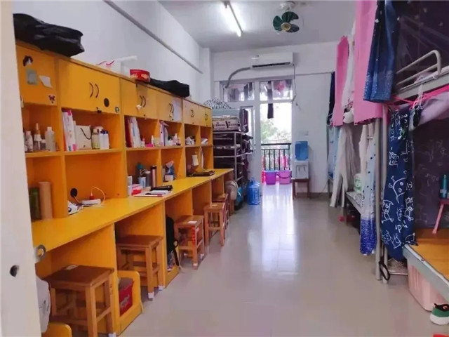 无论男女宿舍统一是六人间,一边为上下床一边为电脑桌,配有风扇、一台饮水机、增城校区有空调还有WIFI,内部空间也算宽敞。