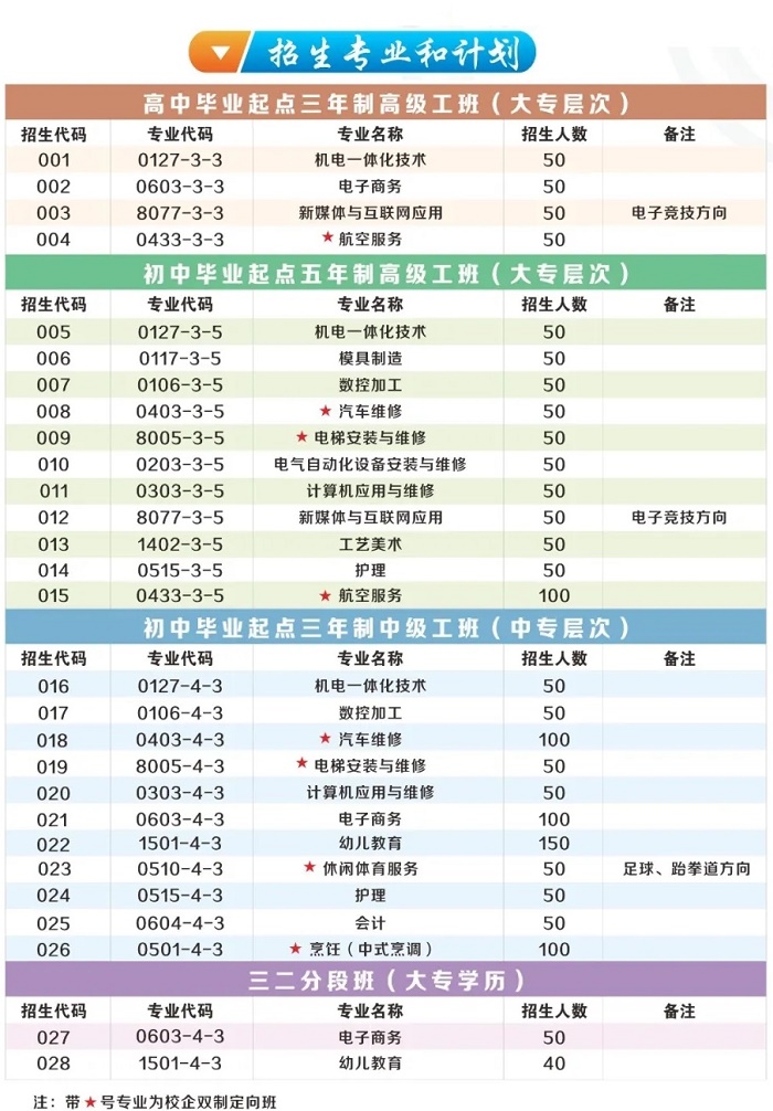 兴宁市高级技工学校设有汽车技术系、艺术系、信息技术系、电气工程系、机械技术系、经济贸易系六个专业系,设有机电一体化、汽车维修、电梯安装与维修、数控加工、电子商务、幼儿教育、航空服务、烹饪、护理等中级工和高级工专业共16个。具体招生专业可以参考其最新的招生简章: